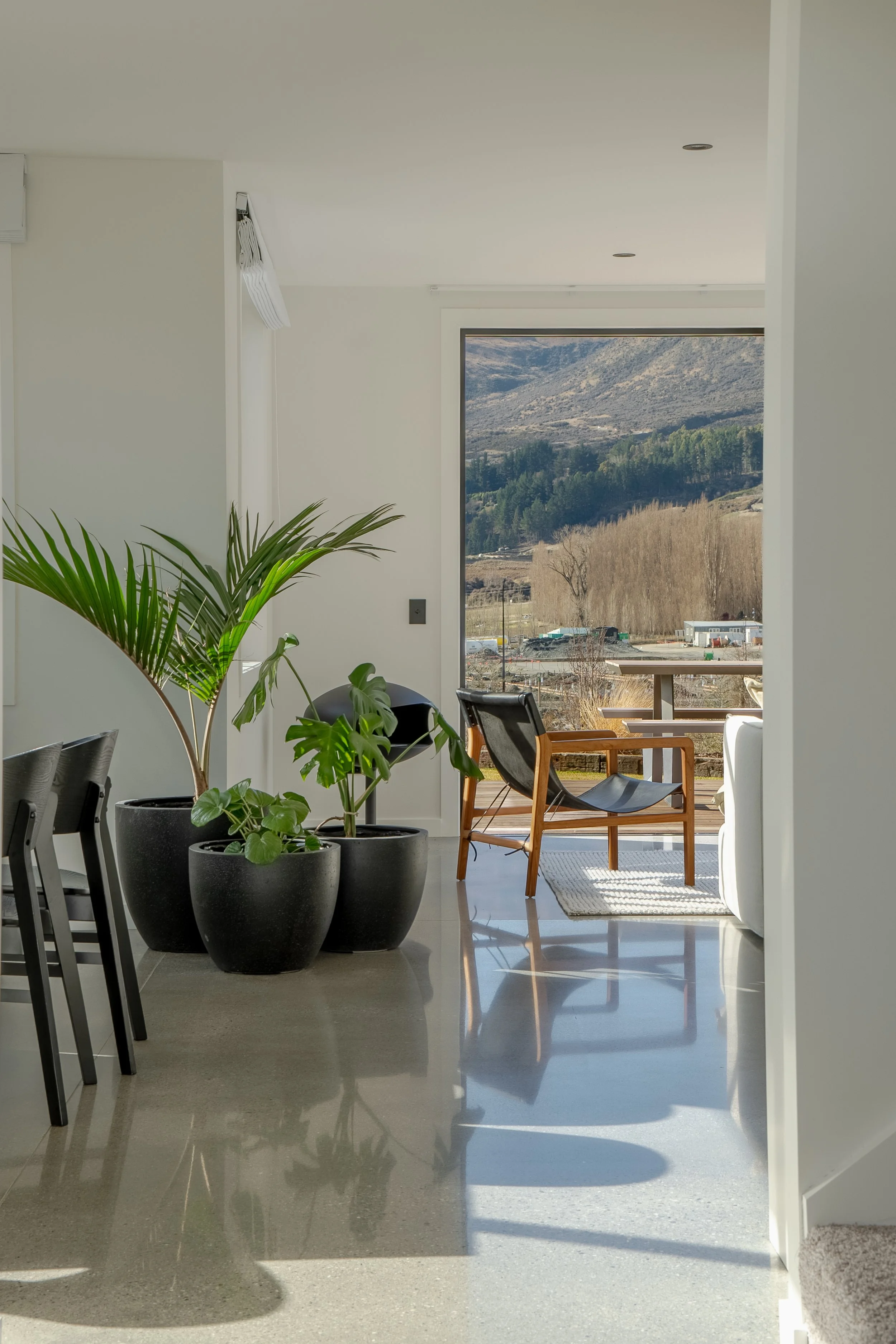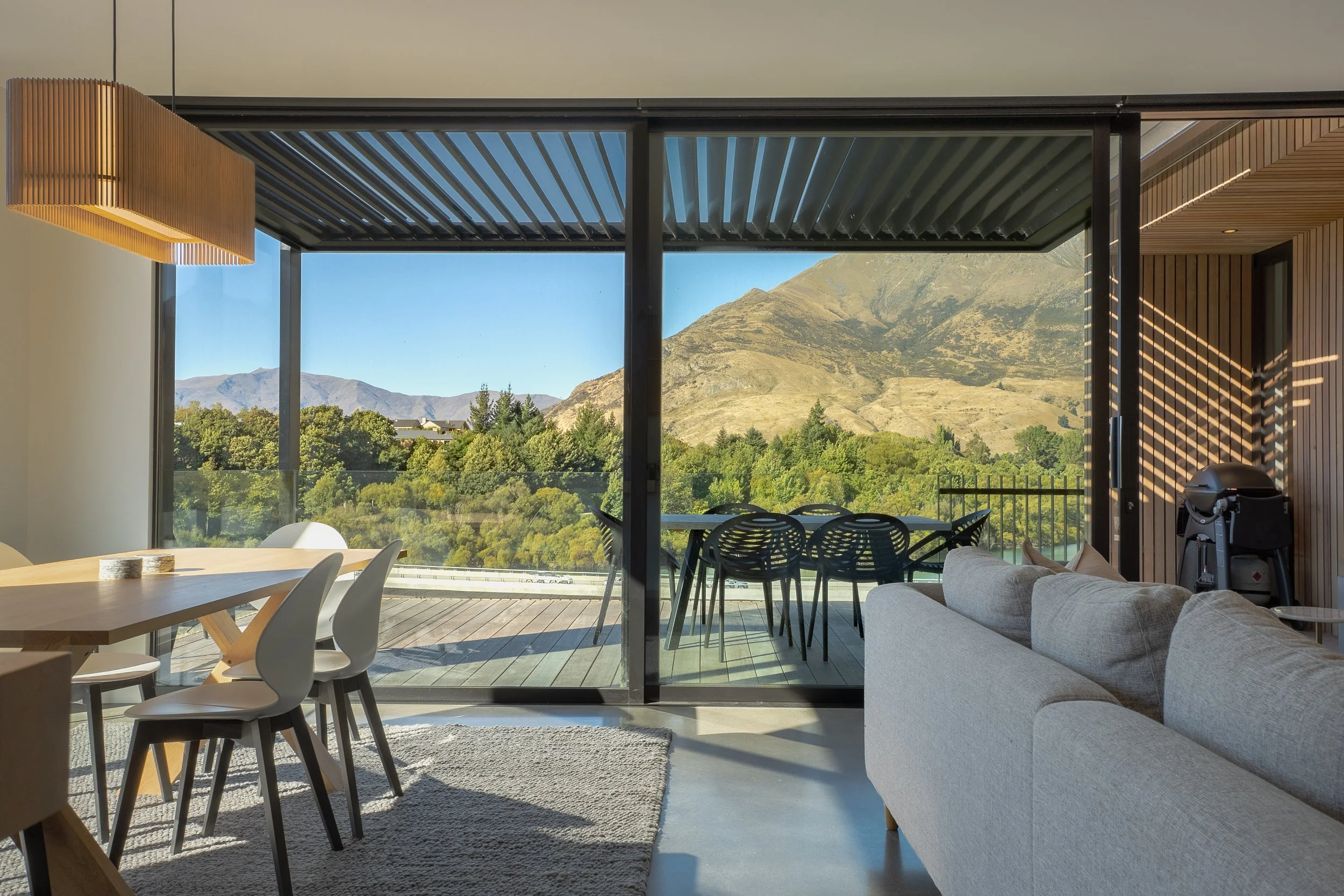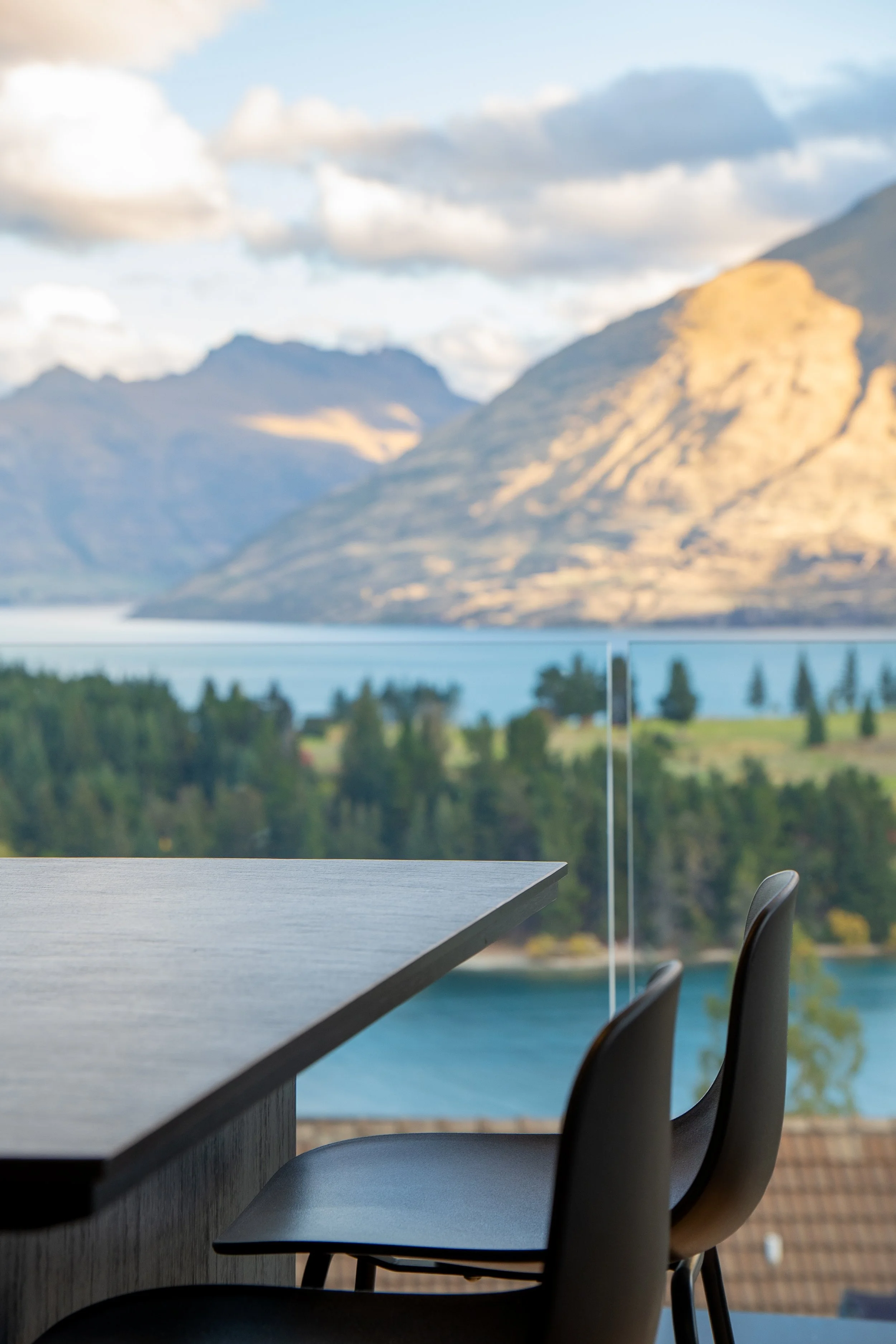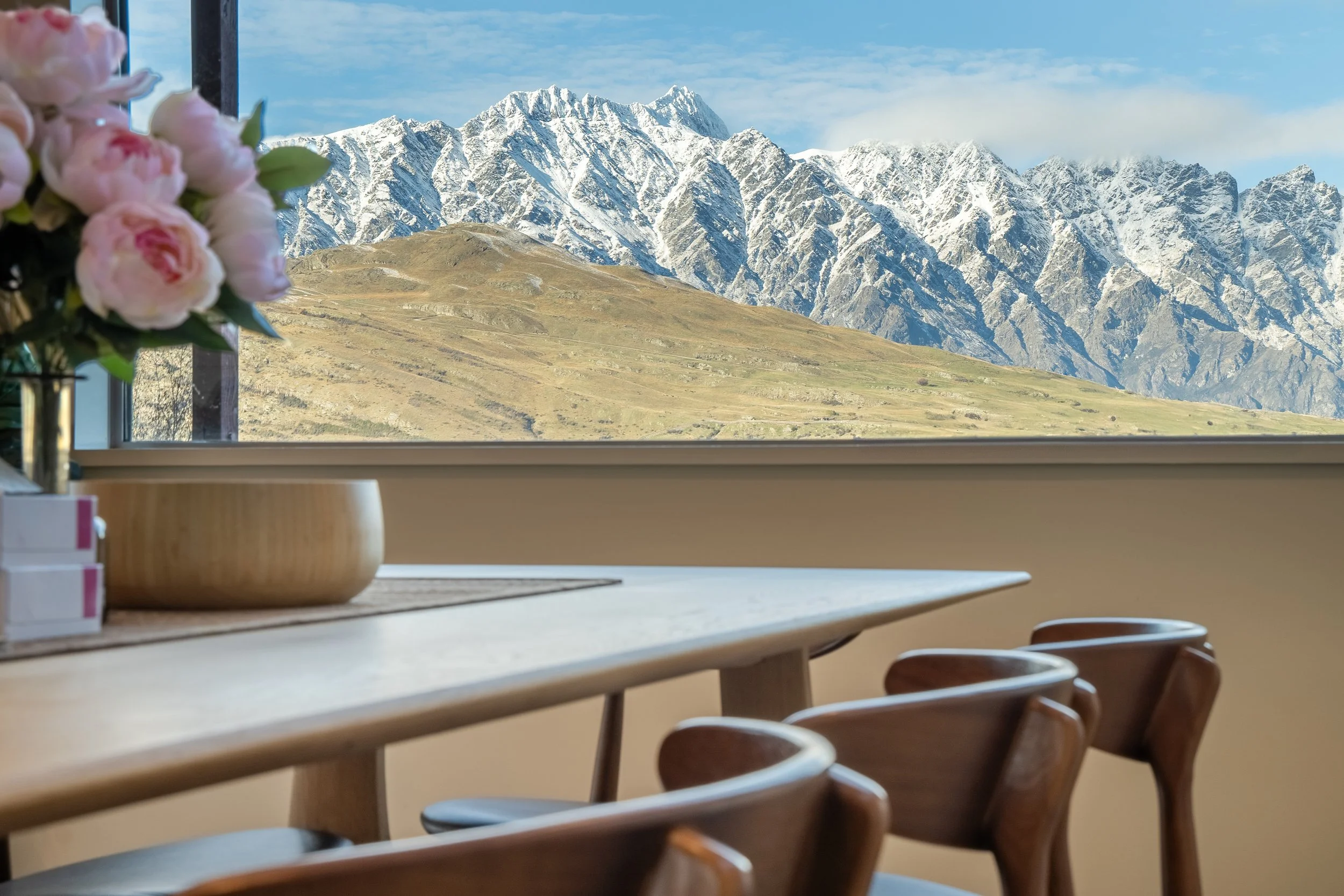 Spacious open-plan living room in a Queenstown Airbnb with lake views and natural light flooding in.