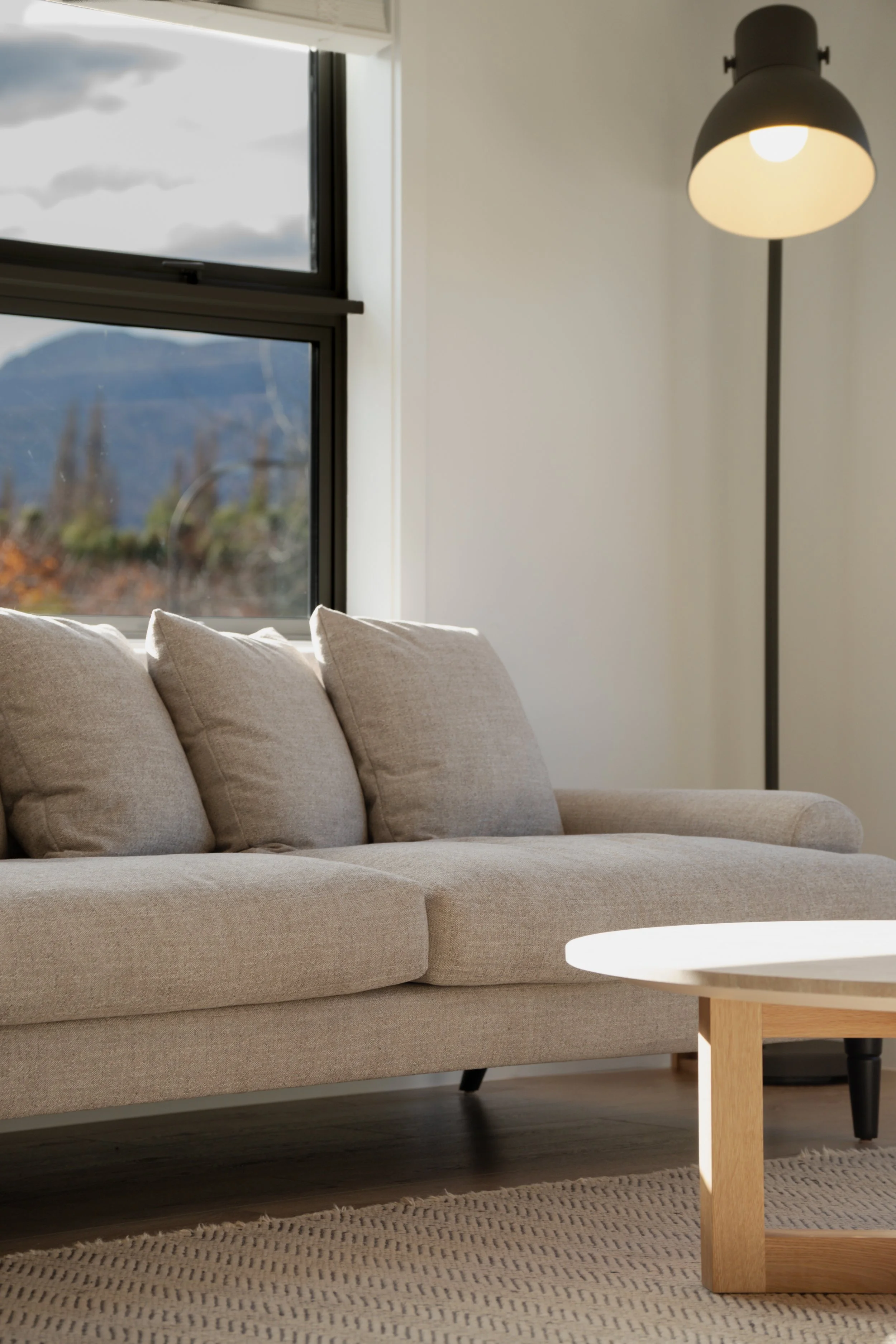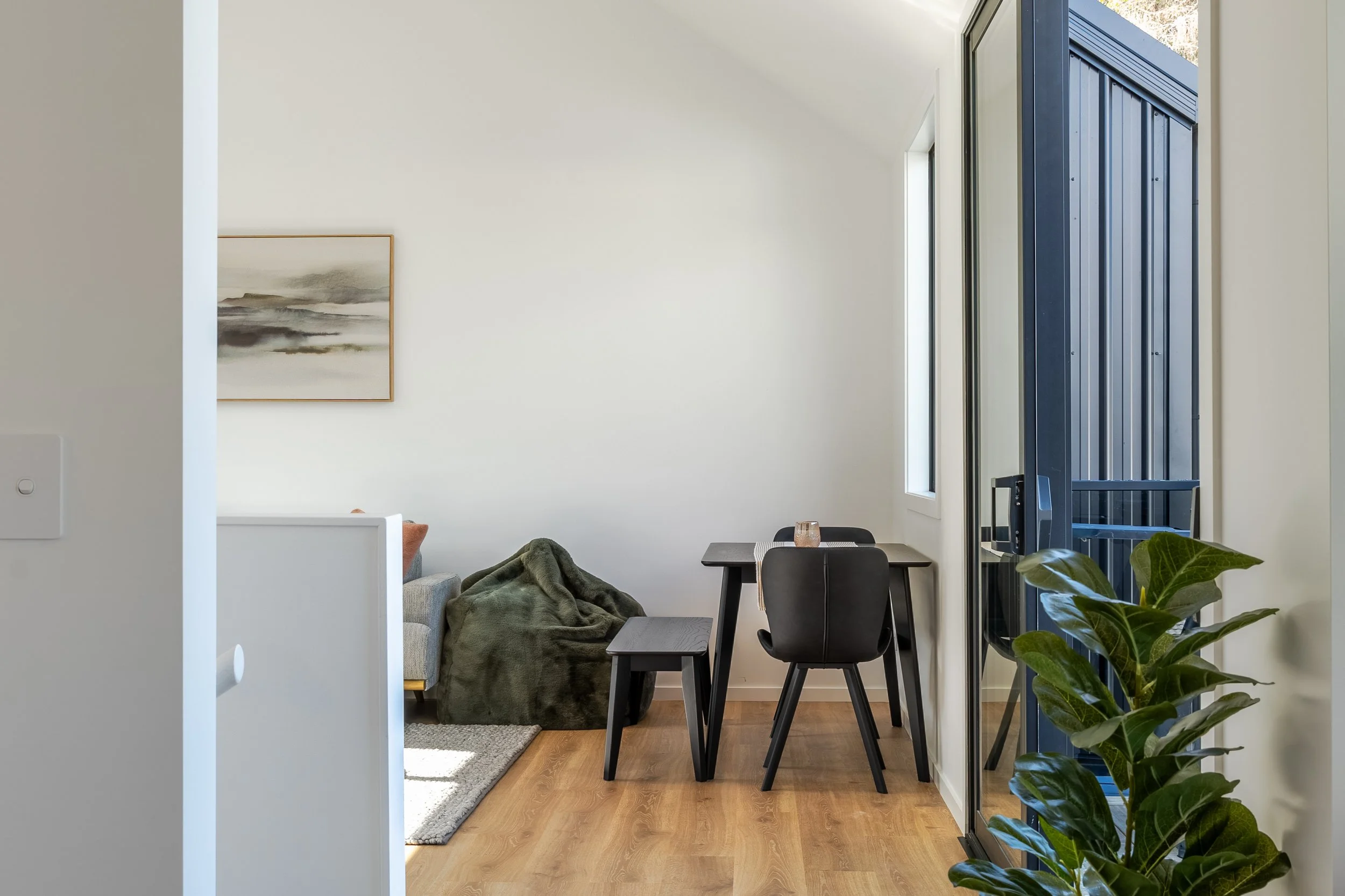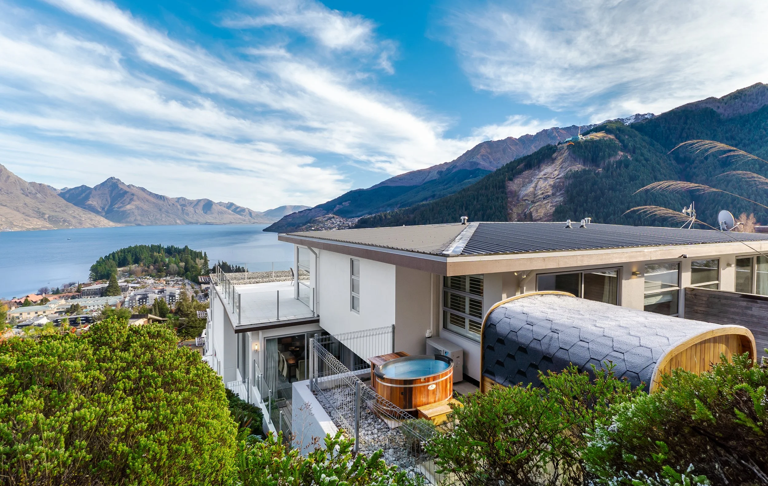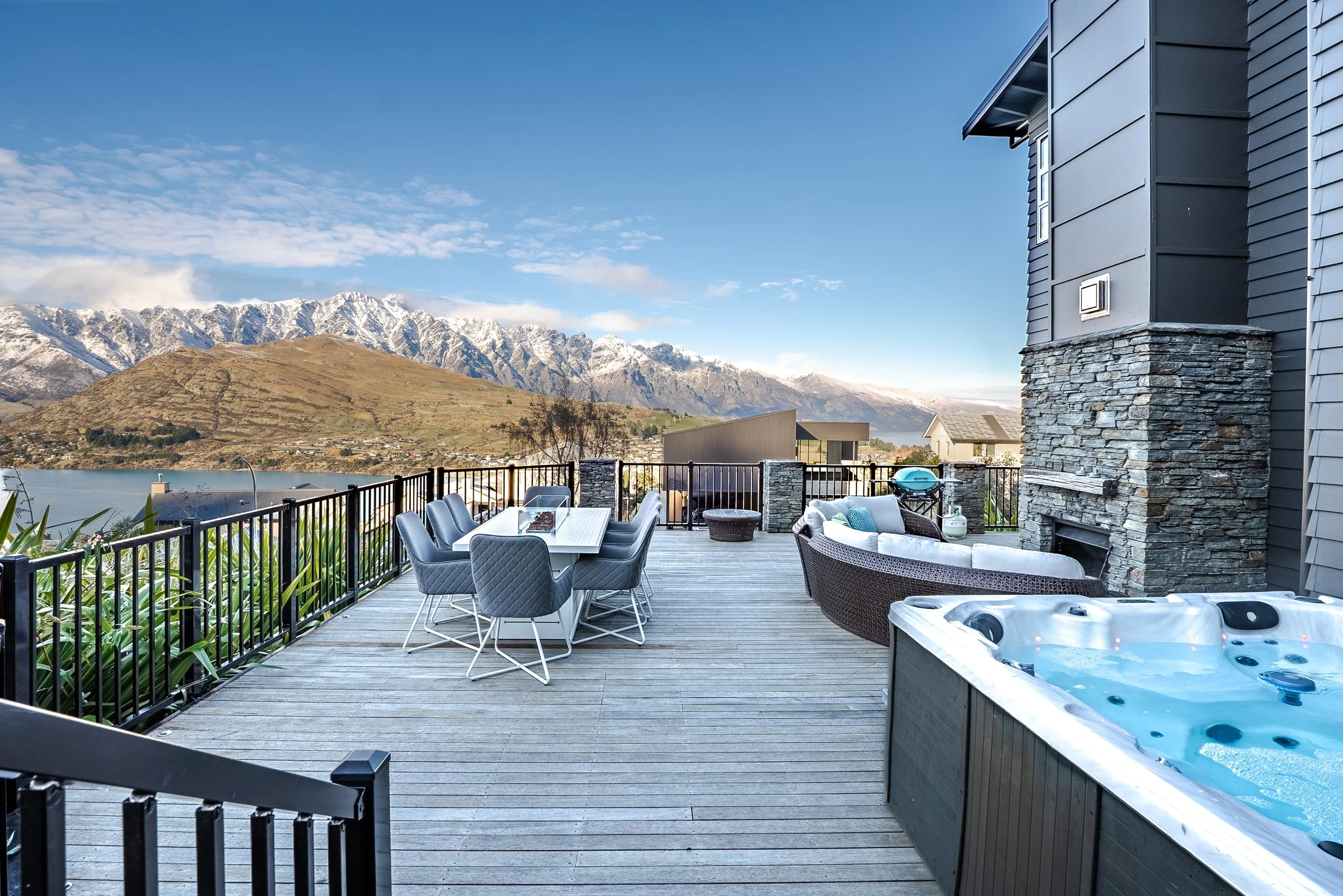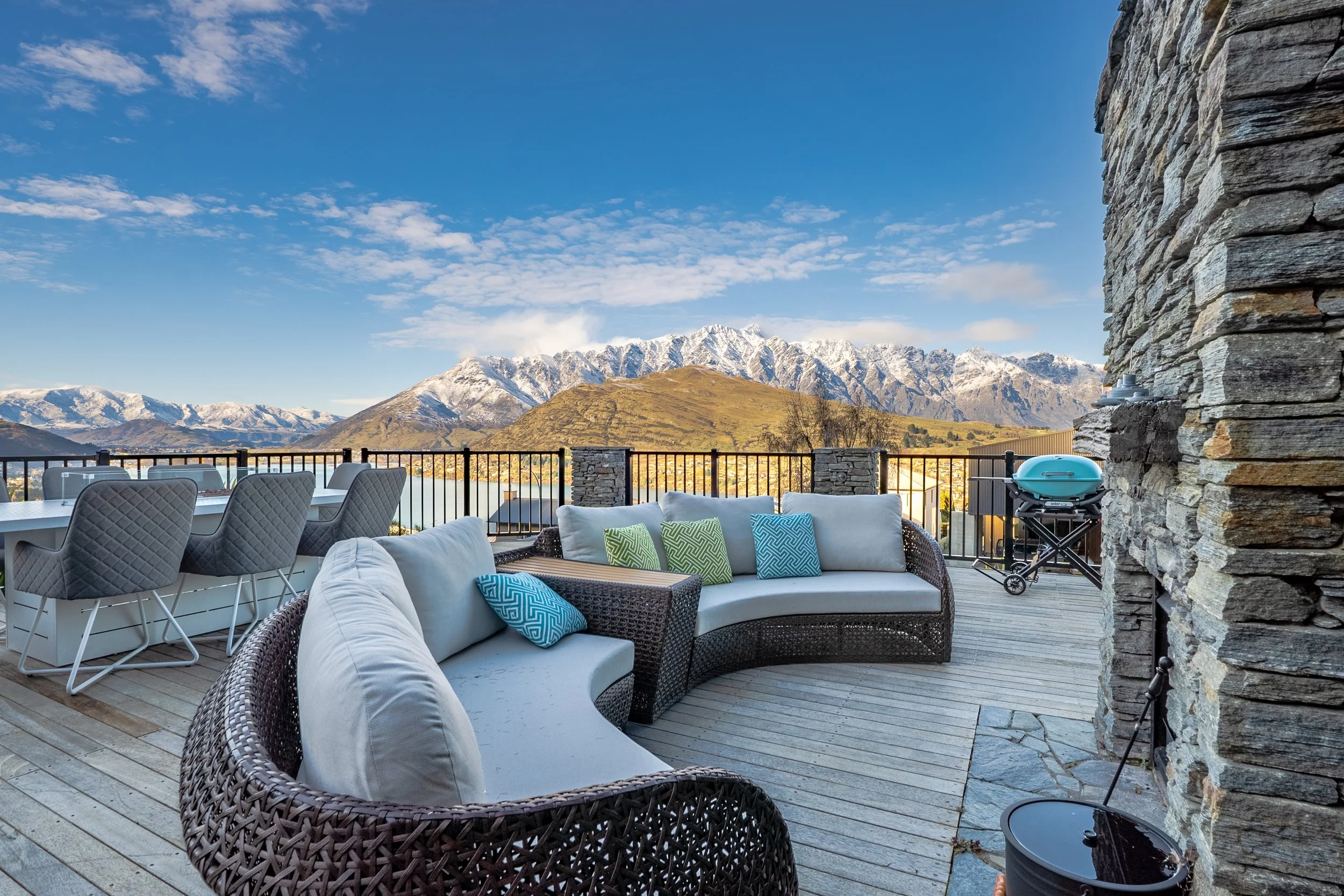 Spacious open-plan living room in a Queenstown Airbnb with lake views and natural light flooding in.