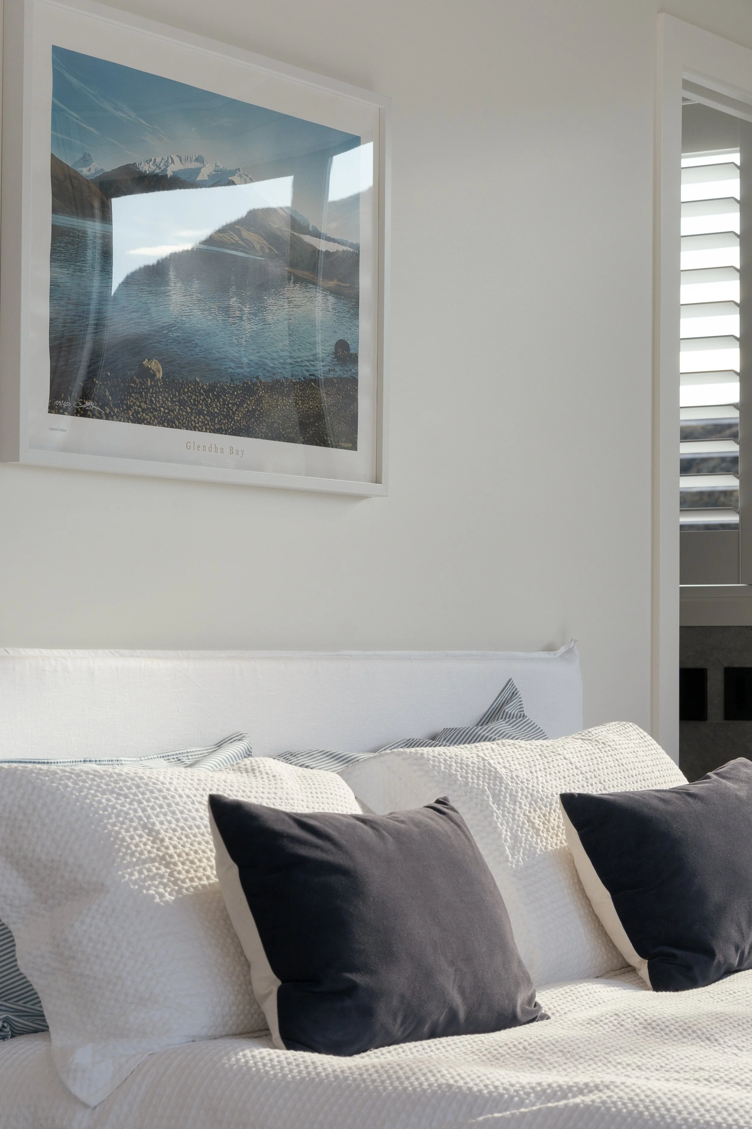Close-up of neatly arranged white and black throw pillows on a Queenstown Airbnb bed, styled for property photography and listing presentation. View fullsize