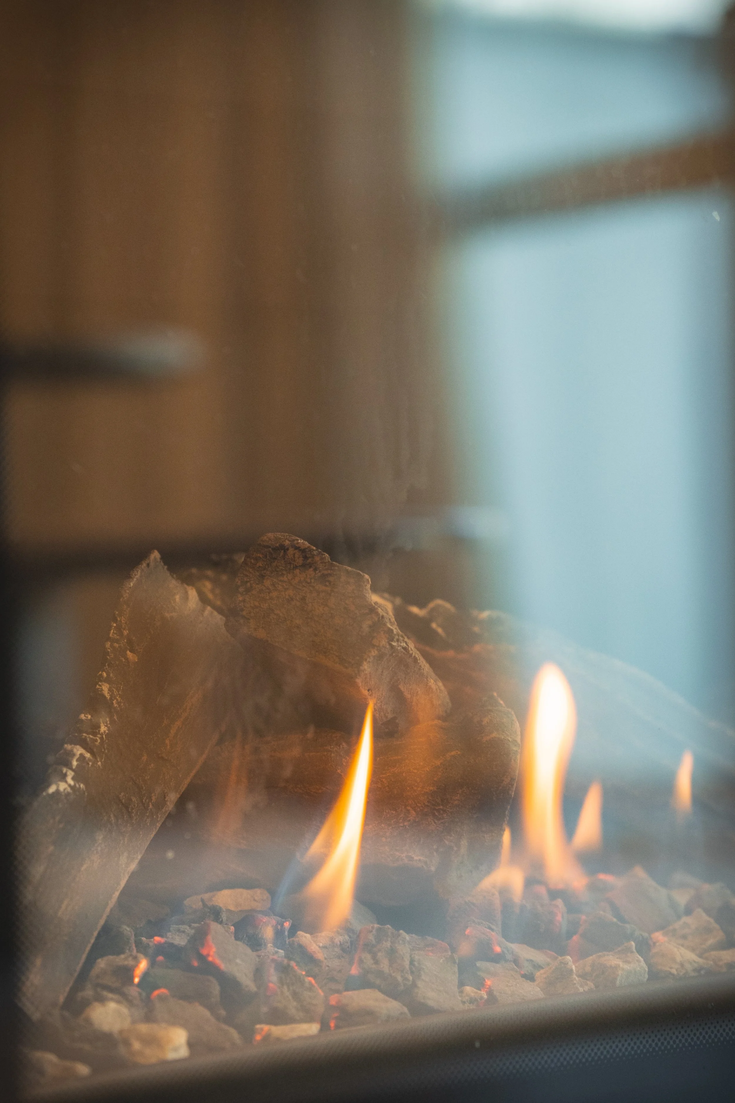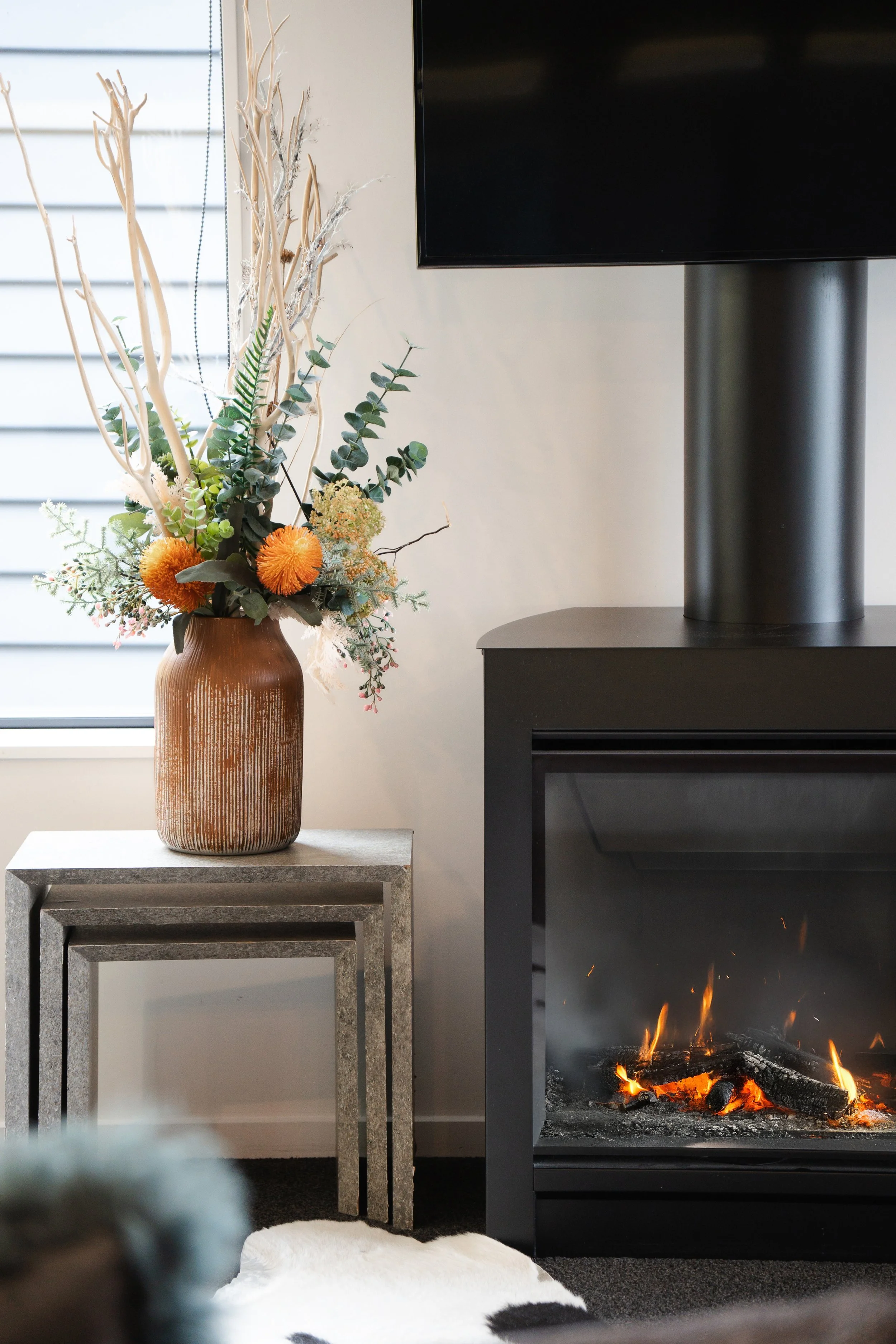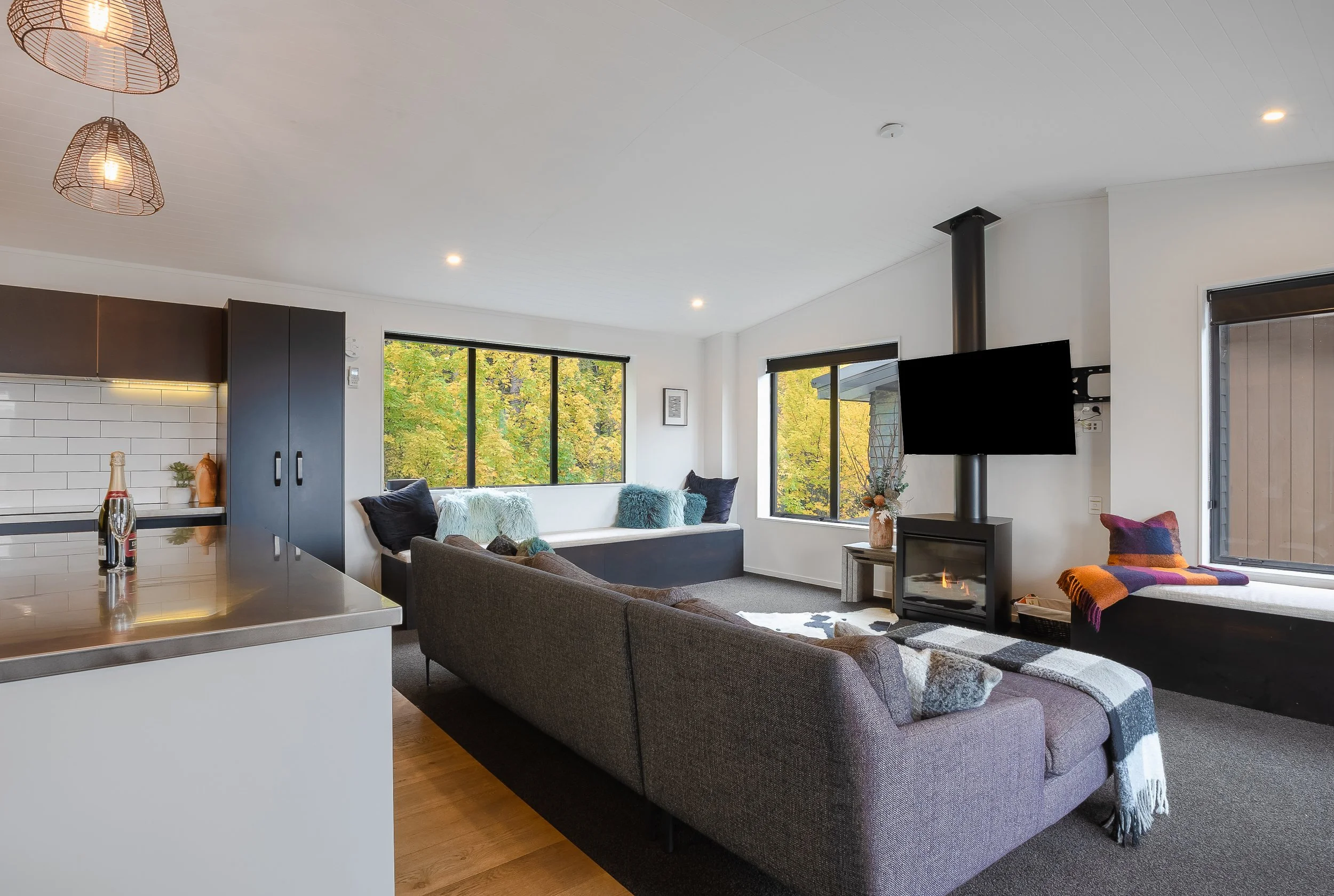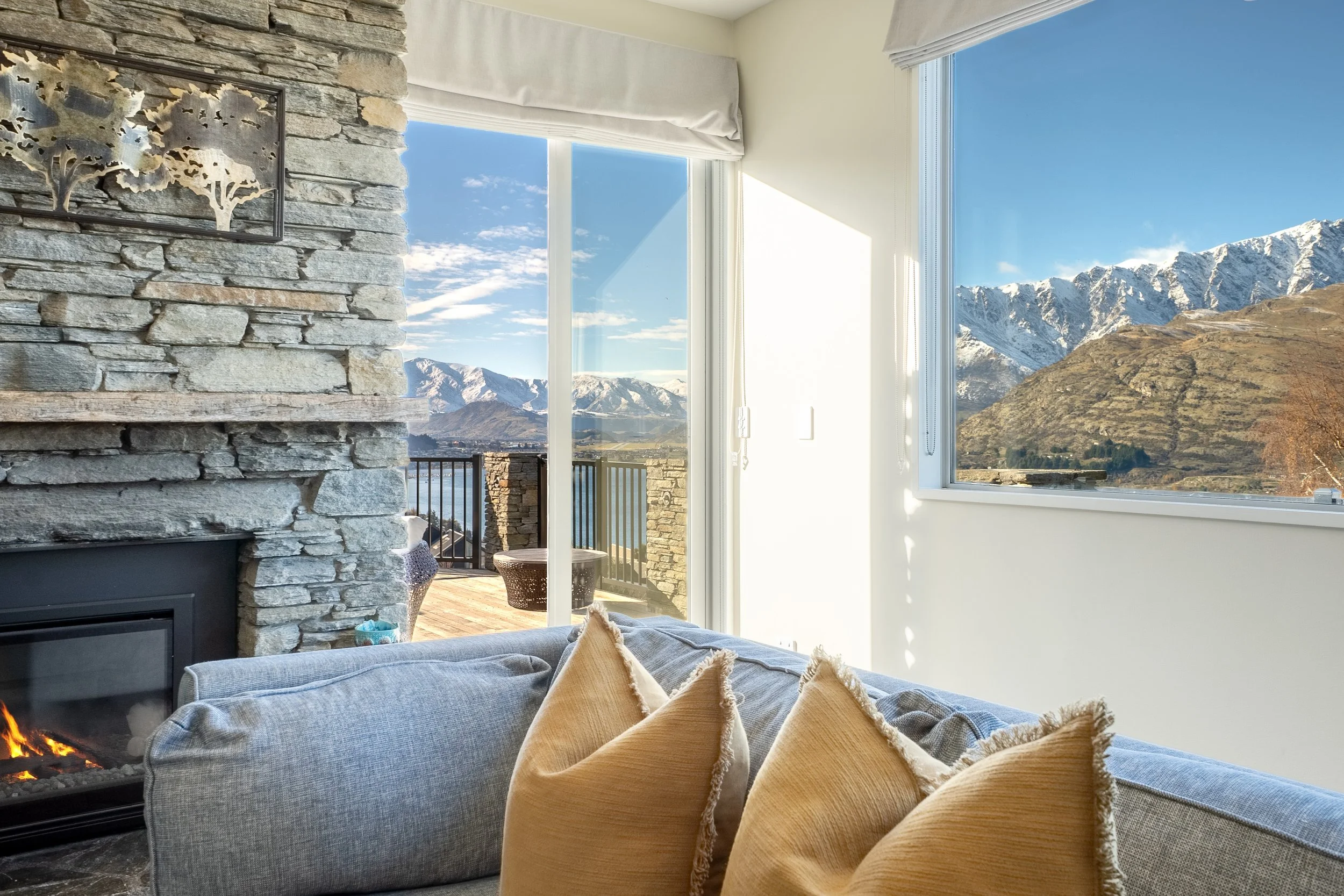 Cosy lounge area with wood burner fireplace and neutral-toned couch in a contemporary Queenstown property.