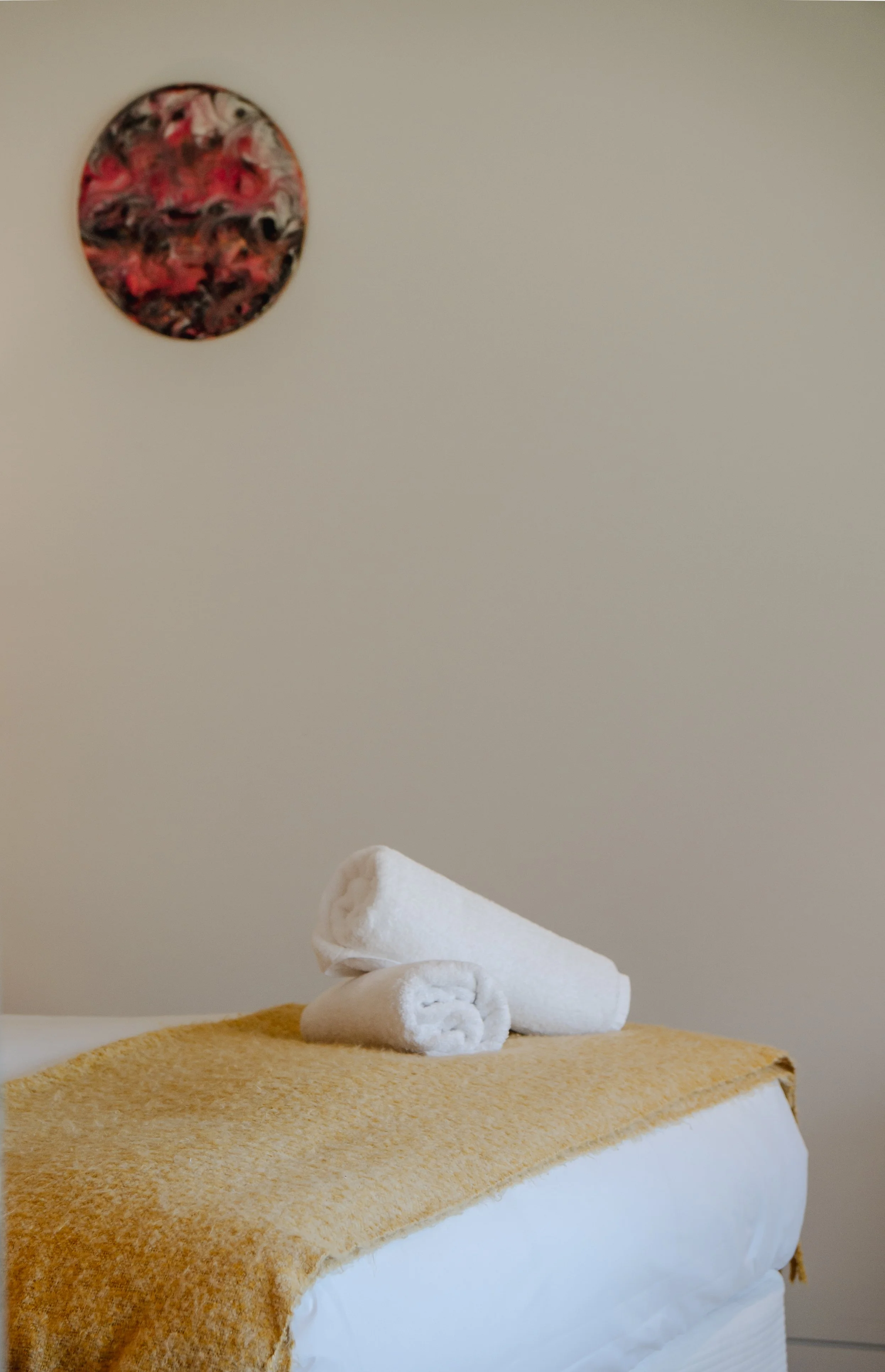 Woven basket with dark towels placed in a cozy bedroom corner, styled for Queenstown Airbnb interiors and real estate photography.