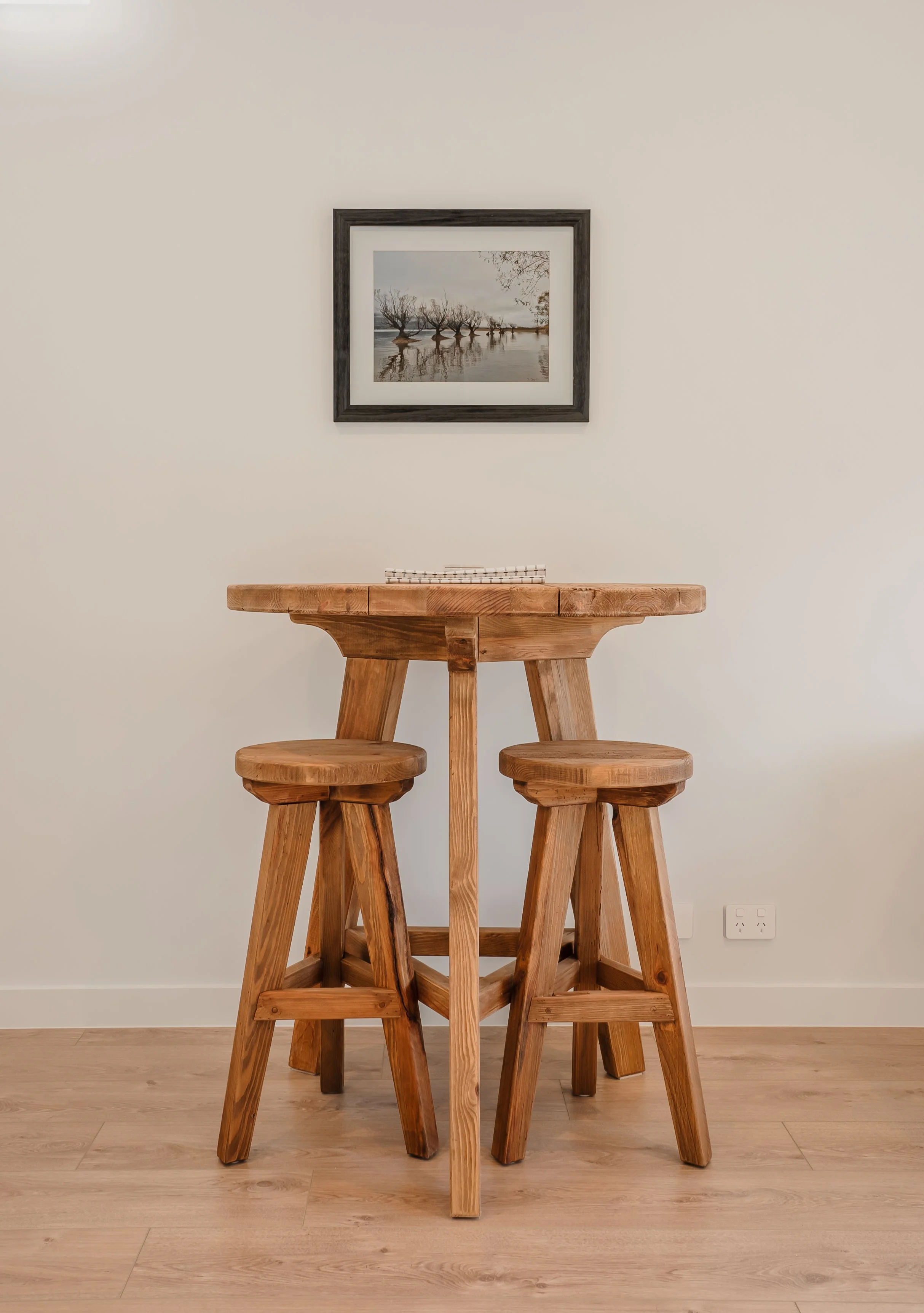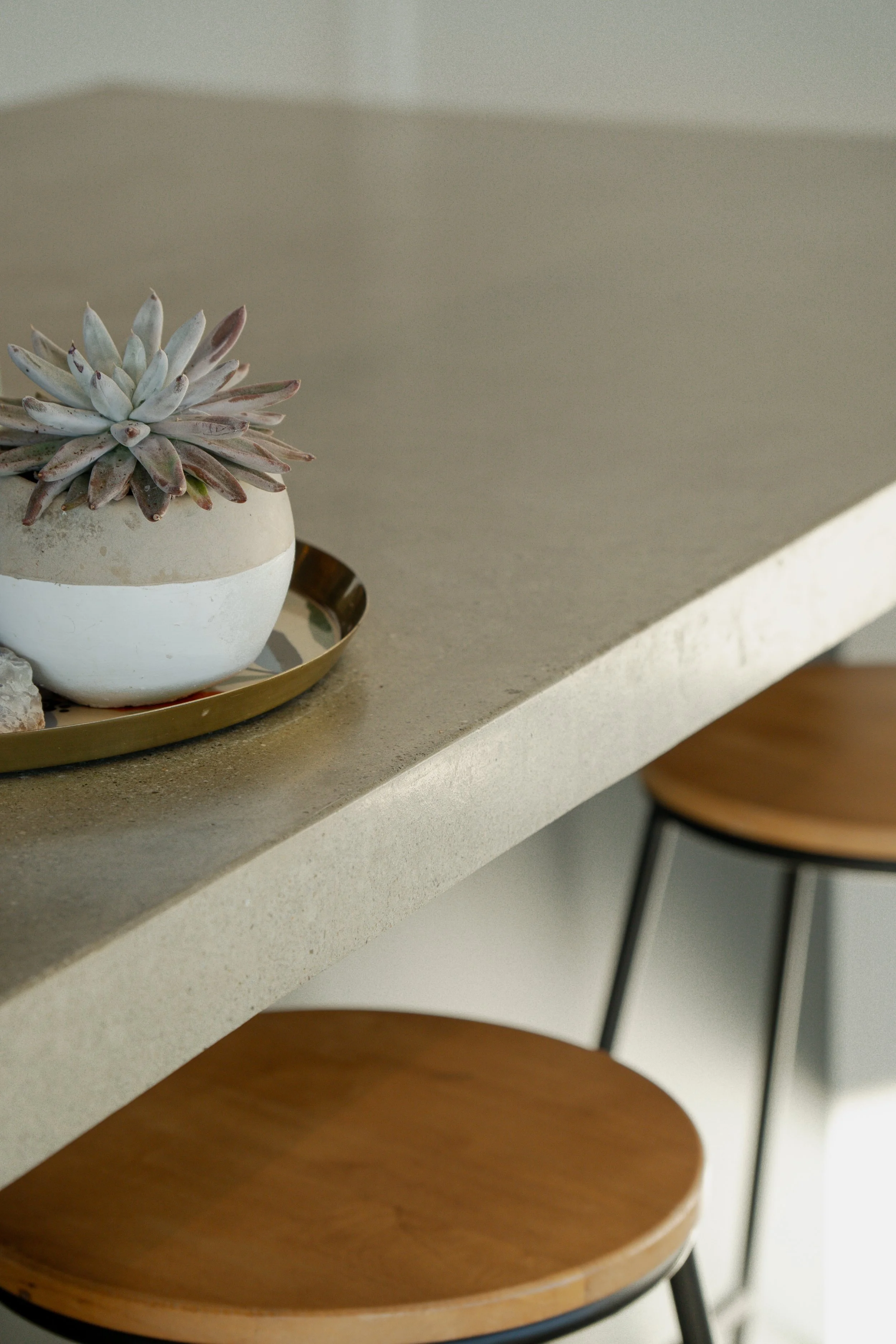 Modern kitchen island with wood stools and floral arrangement, photographed for Queenstown property sale listing