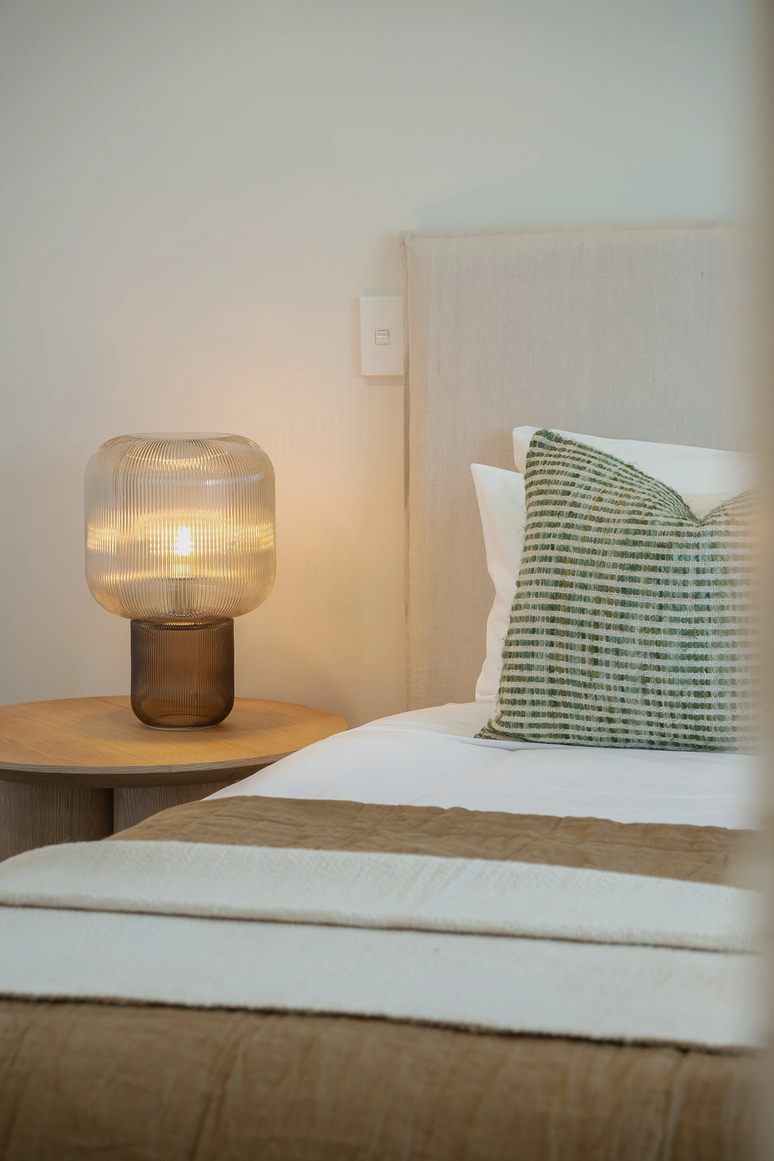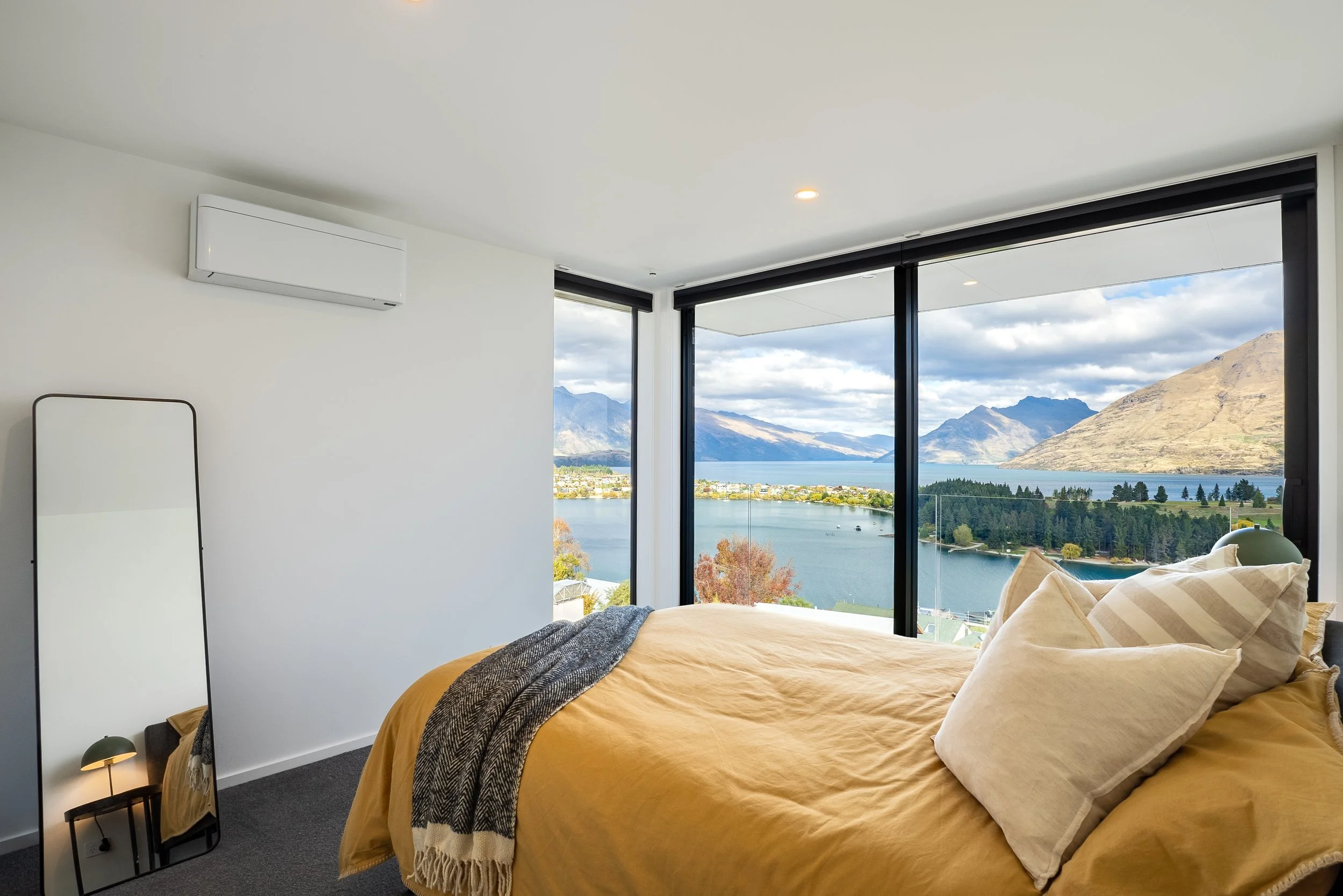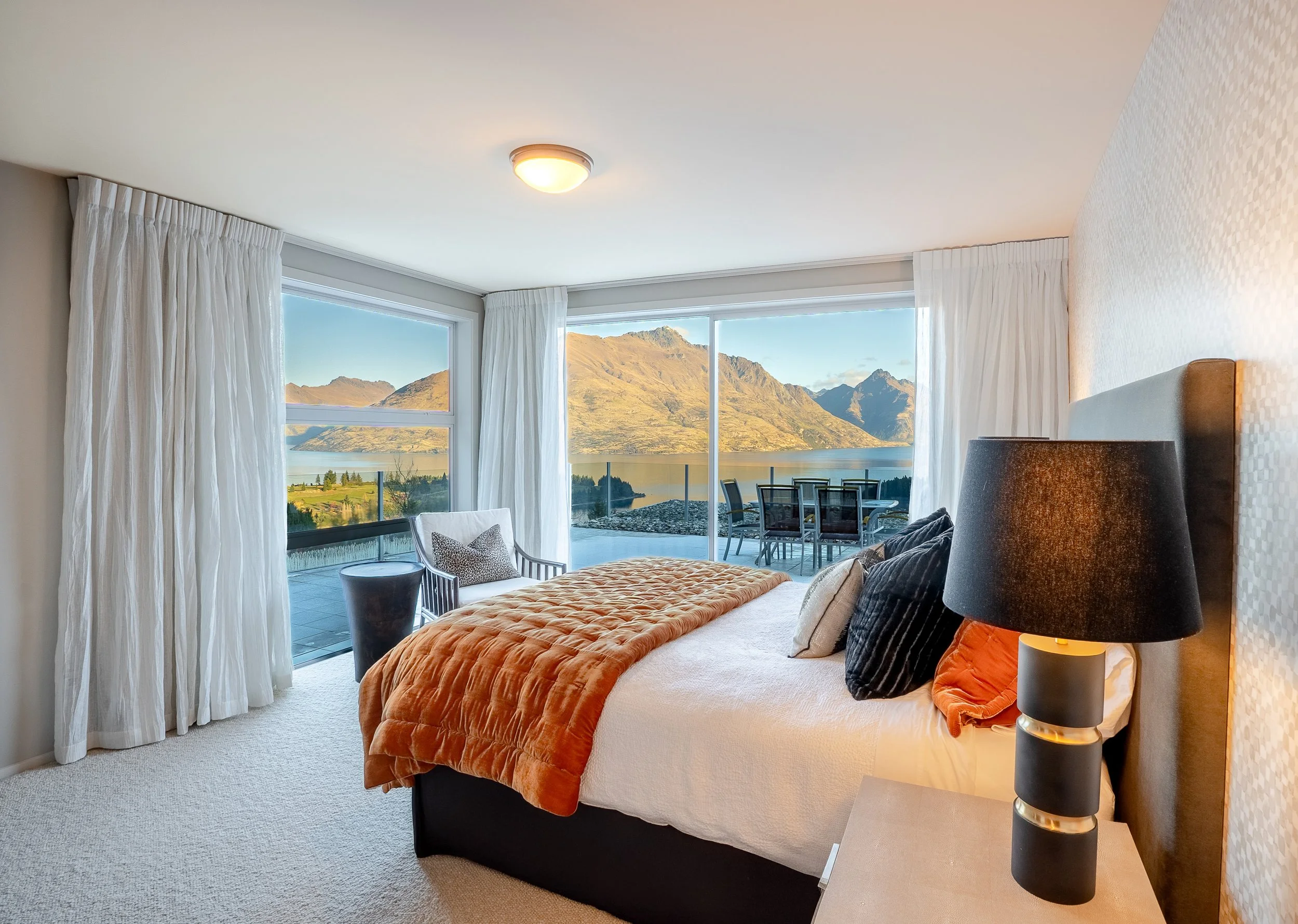 Queenstown property bedroom photographed through glass door, showing warm lighting and styled bedding — perfect for real estate listings