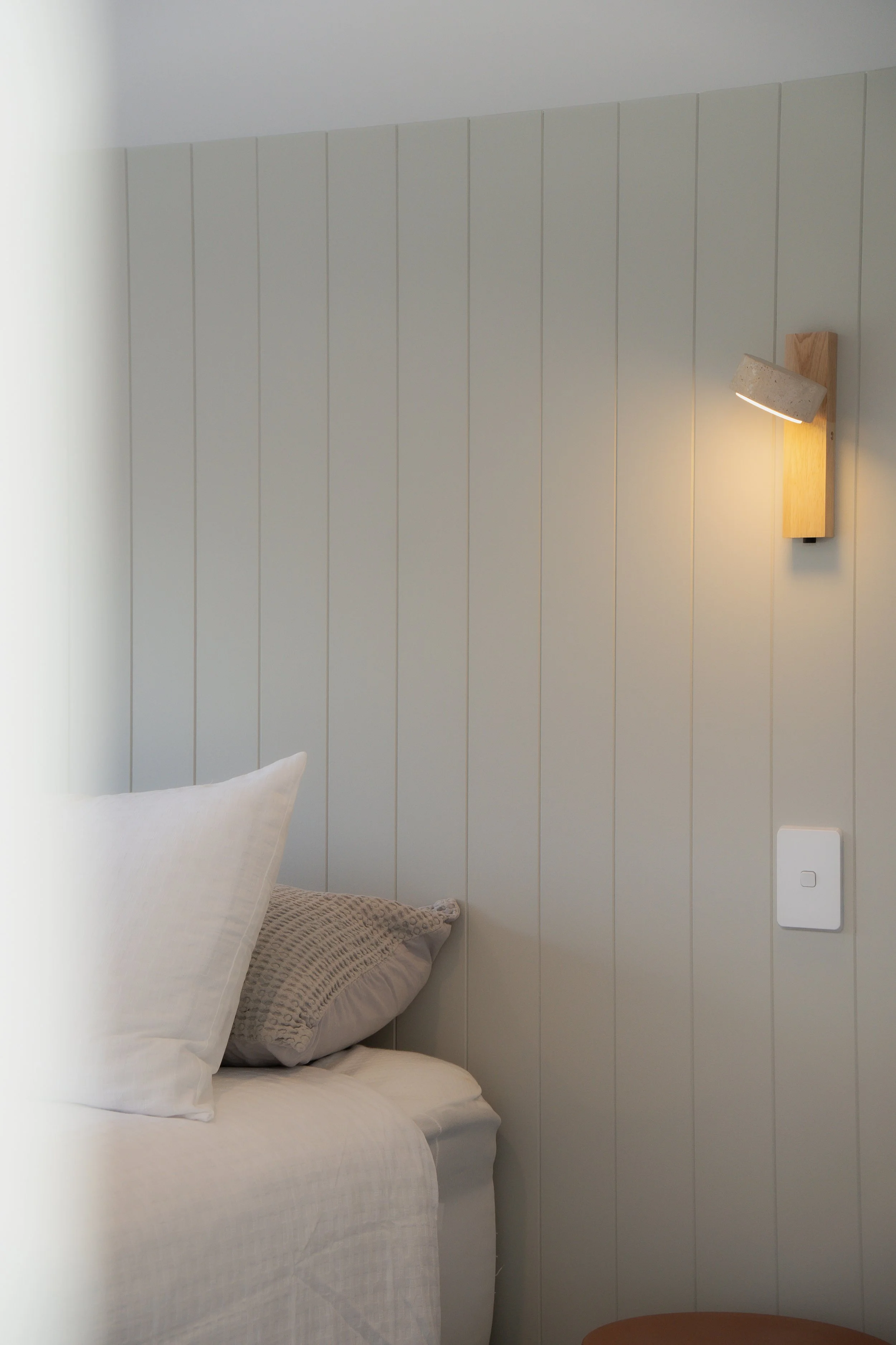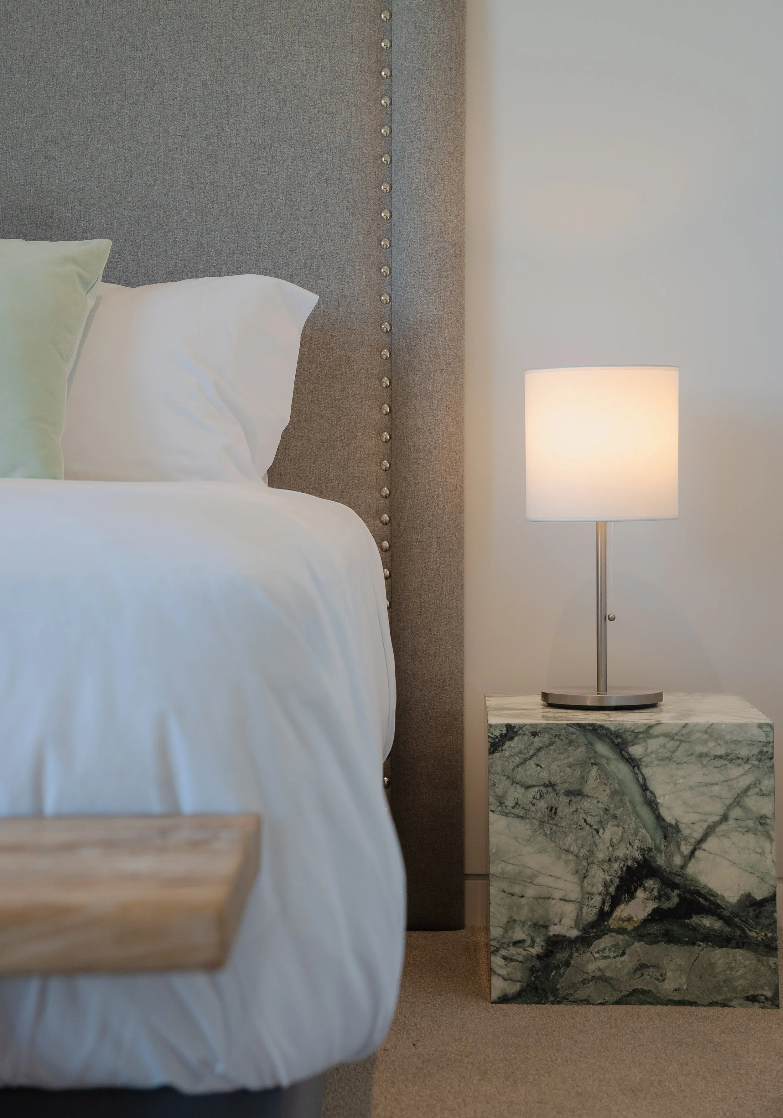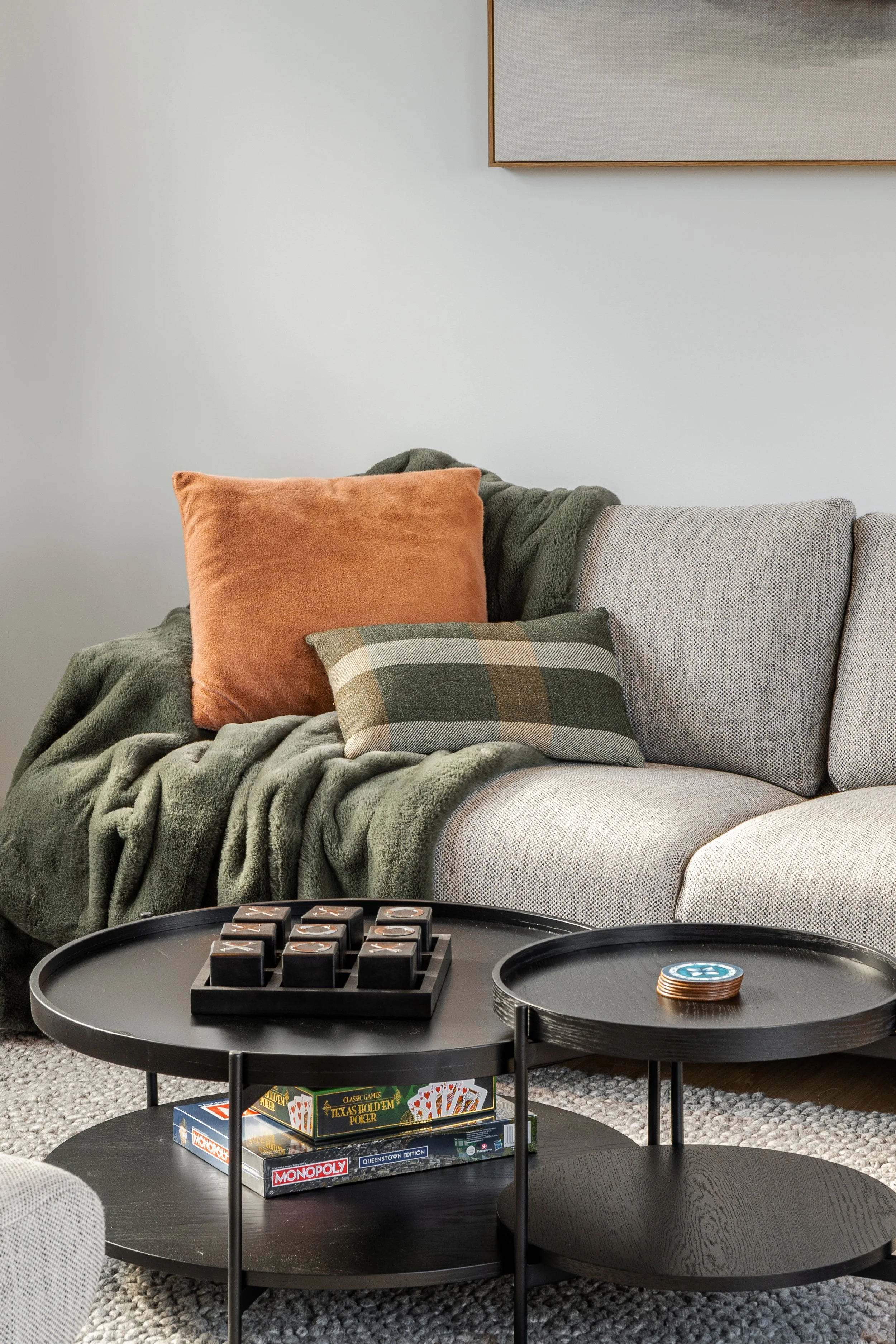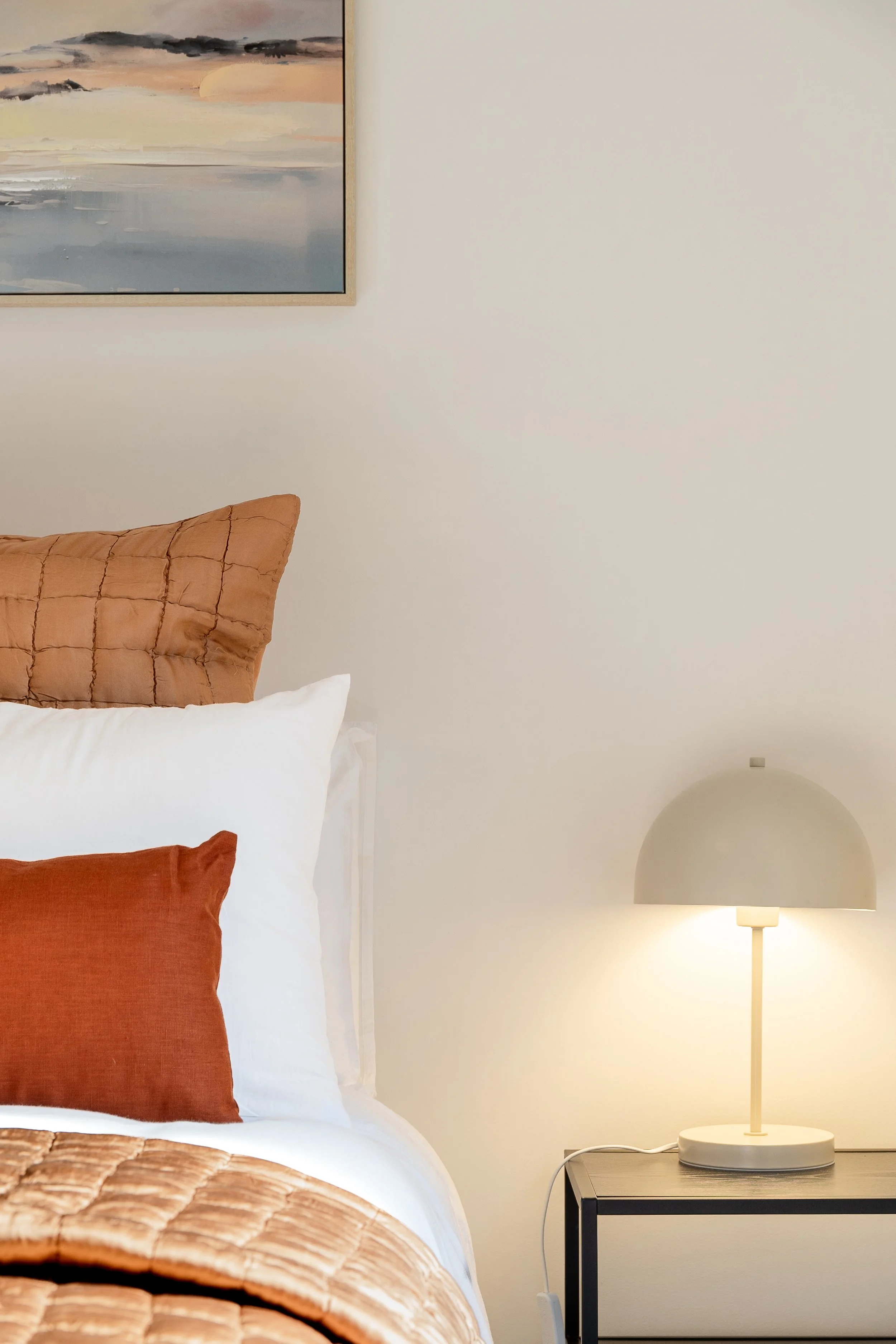 Close-up of neatly arranged white and black throw pillows on a Queenstown Airbnb bed, styled for property photography and listing presentation.