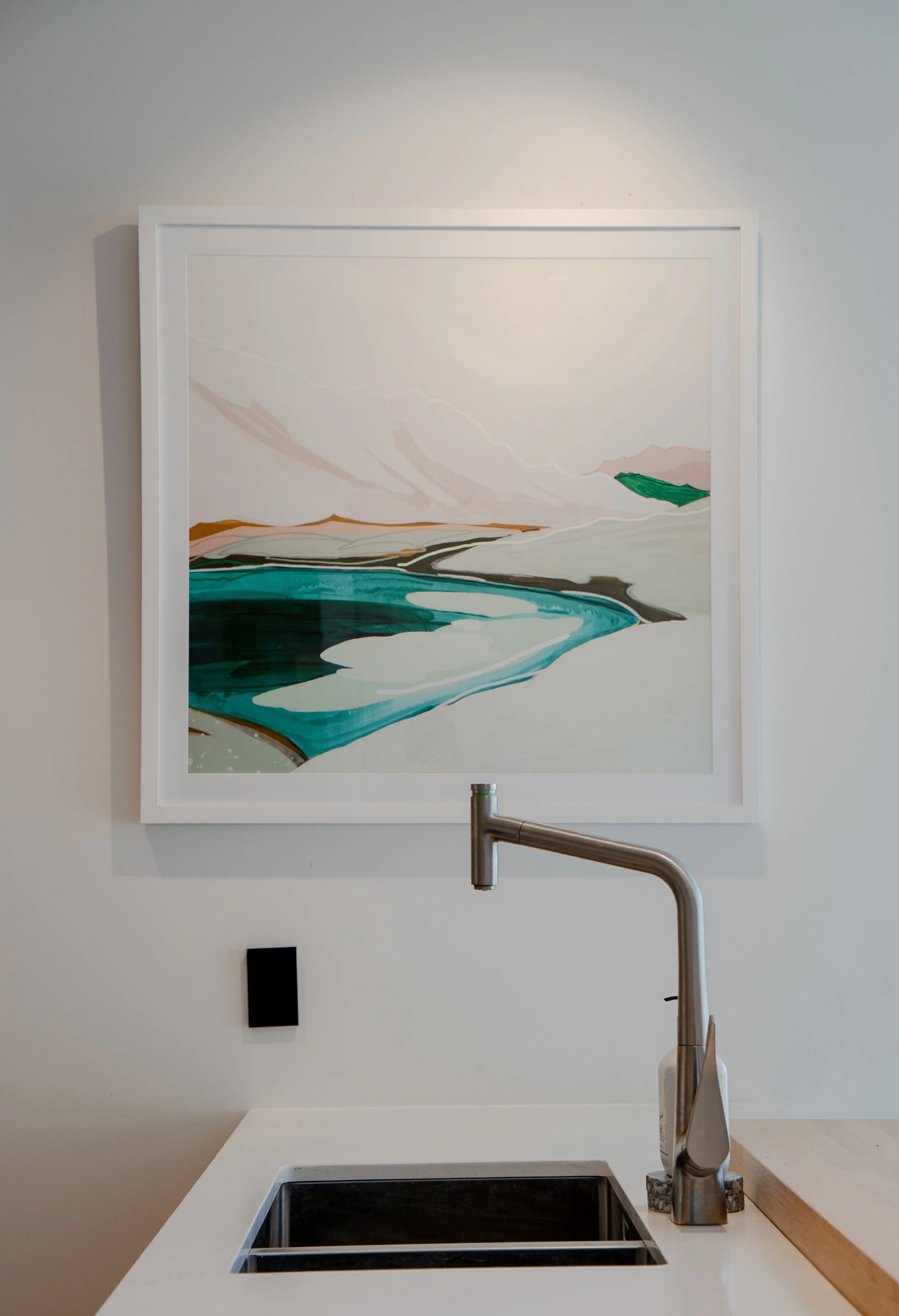 Modern hallway interior with pendant lighting and art, leading into an open-plan kitchen and living space in a Queenstown home. View fullsize