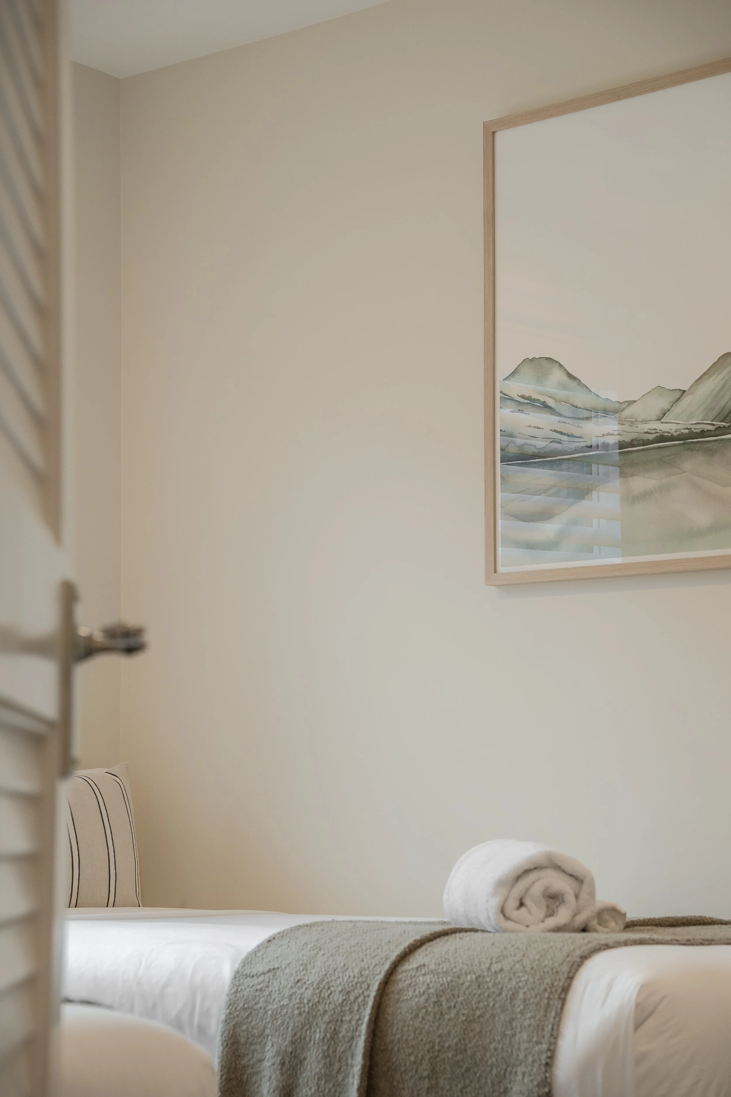Woven basket with dark towels placed in a cozy bedroom corner, styled for Queenstown Airbnb interiors and real estate photography. View fullsize