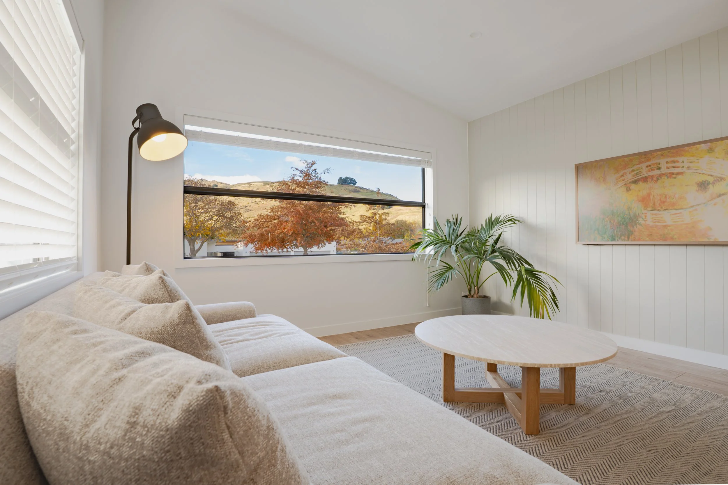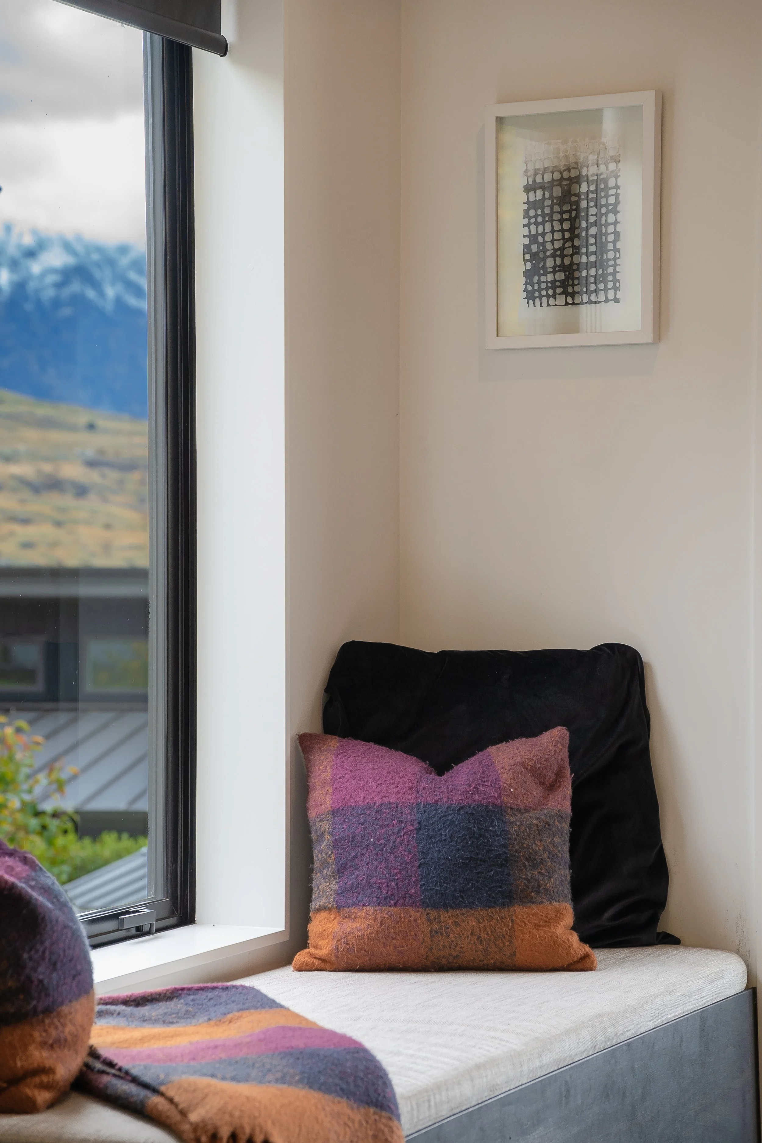 Bright and inviting living area with natural light, styled cushions, and garden outlook — real estate image for Queenstown home