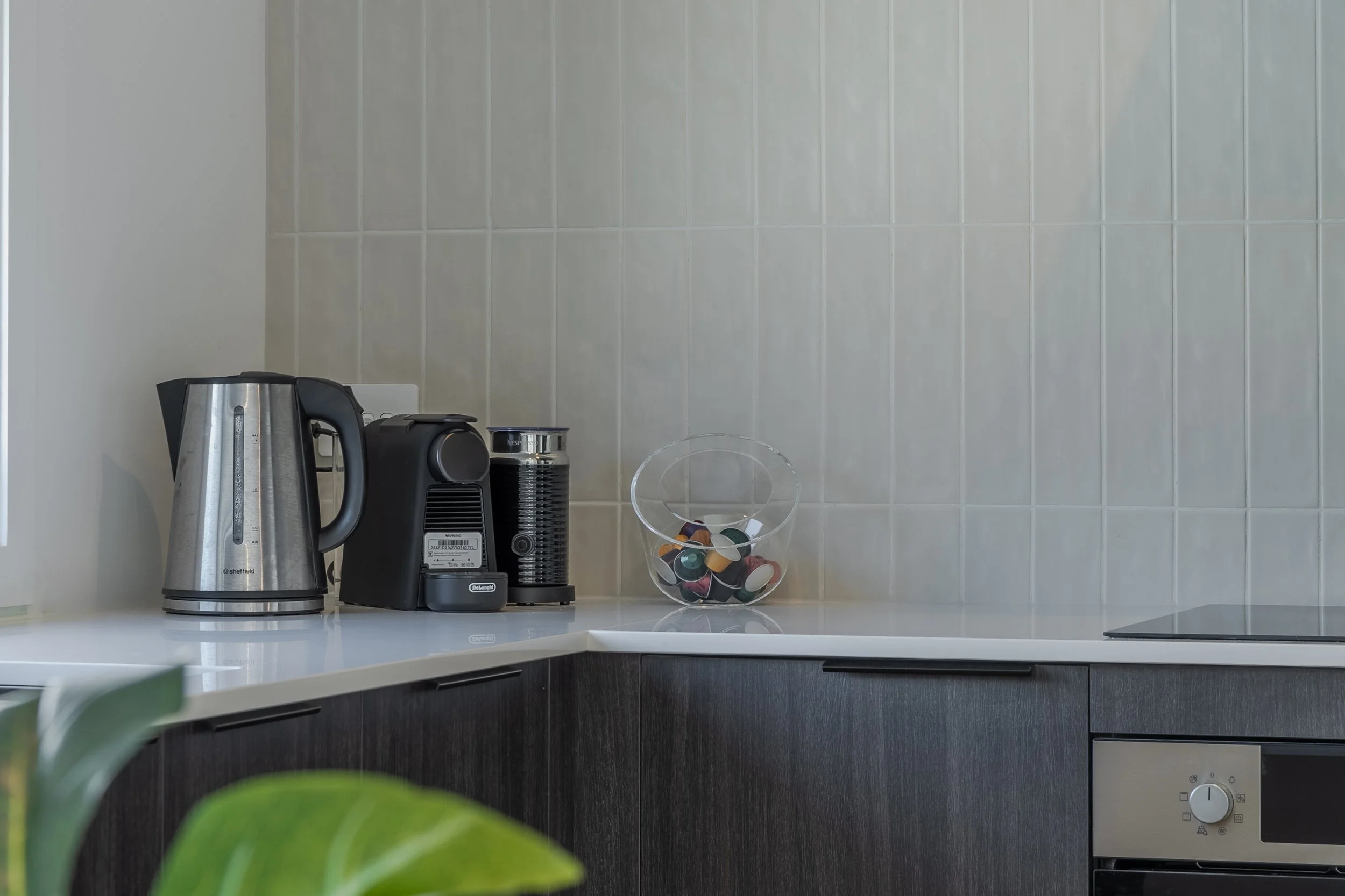 Modern ceramic cooktop with tiled splashback, styled for Queenstown property marketing shoot