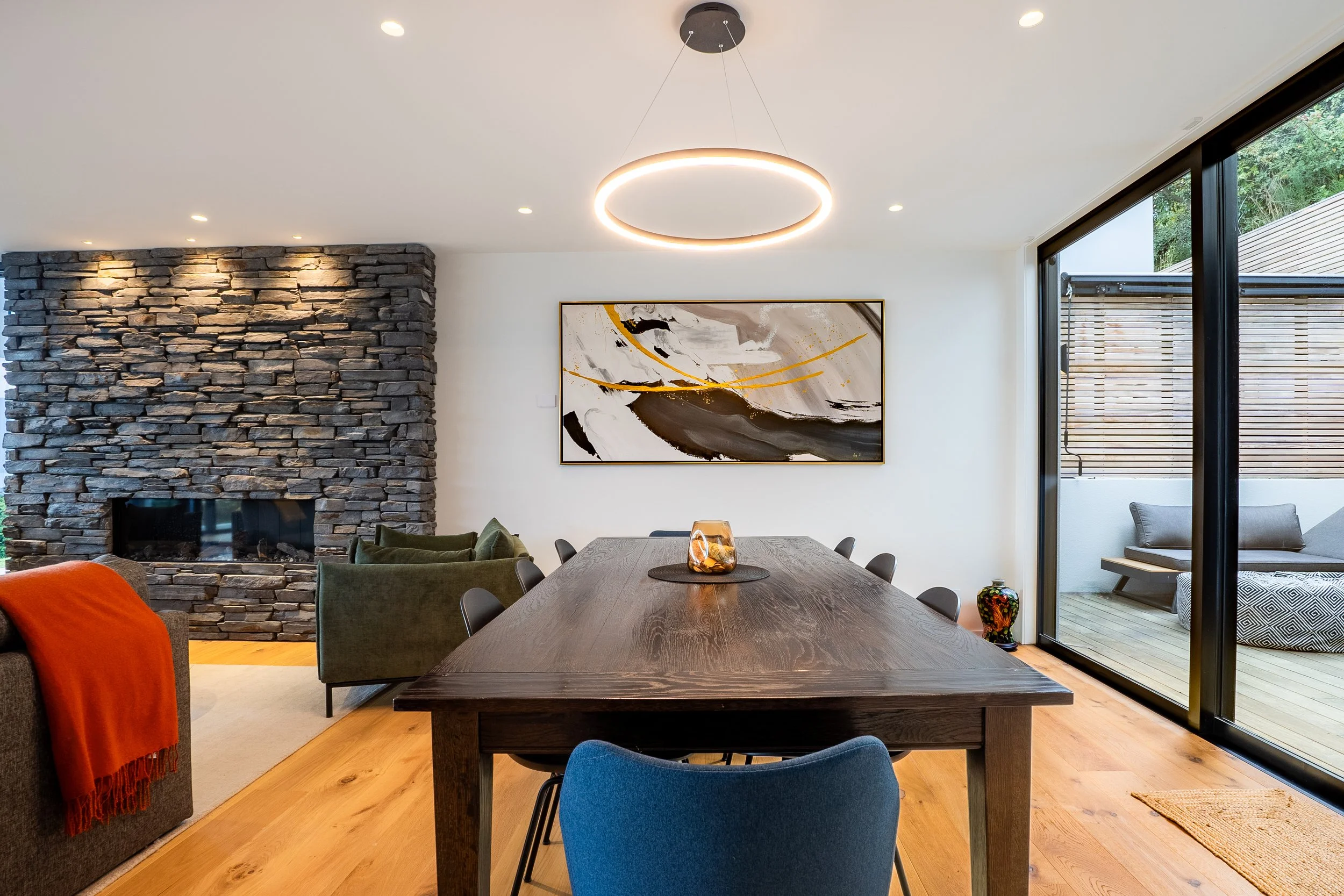 Cosy lounge area with wood burner fireplace and neutral-toned couch in a contemporary Queenstown property. View fullsize